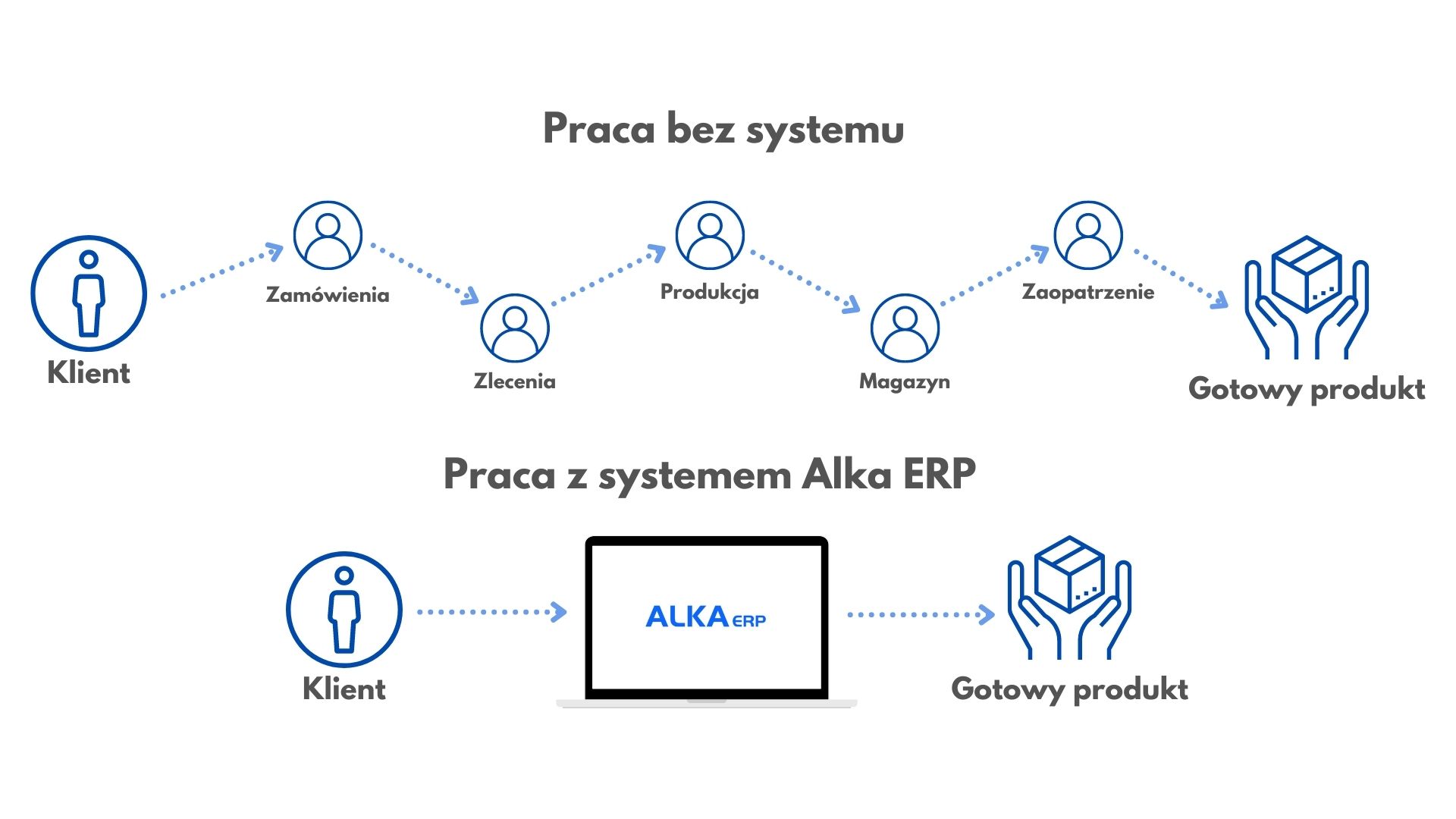 System Alka ERP w znaczy sposób przyśpiesza oraz ułatwia zachodzenie wielu procesów w firmie. Konsekwencją tego jest skrócenie procesu realizacji zamówień poprzez ich automatyzację. Dzięki temu zmniejsza się zapotrzebowanie na pracowników, a działania realizowane przez system zmniejszają ryzyko błędów popełnianych przez człowieka. Dodatkowym plusem jest ograniczenie kosztów związanych zatrudnieniem mniejszej ilości osób.